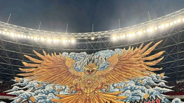 La Grande Indonesia menghadirkan koreografi spektakuler saat Timnas Indonesia menghadapi Bahrain di Kualifikasi Piala Dunia 2026 di SUGBK, Selasa (25/3/2025). Ribuan suporter membentangkan koreo raksasa bergambar Garuda dengan sayap terkepak dan angka “45” di tengahnya sebagai simbol kemerdekaan. Suporter menampilkan tulisan “Show Your Dignity” di bagian bawah sebagai seruan untuk menjaga harga diri bangsa.